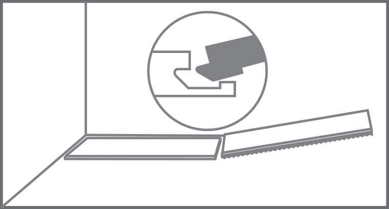 Start laying the floor in the left corner. Place an 8 mm spacer against the left wall and position the board against the spacer with the groove side exposed. Press the next plank into a corner so that the short side tab lines up with the short side groove of the first plank. Then lay it down. Continue the first line